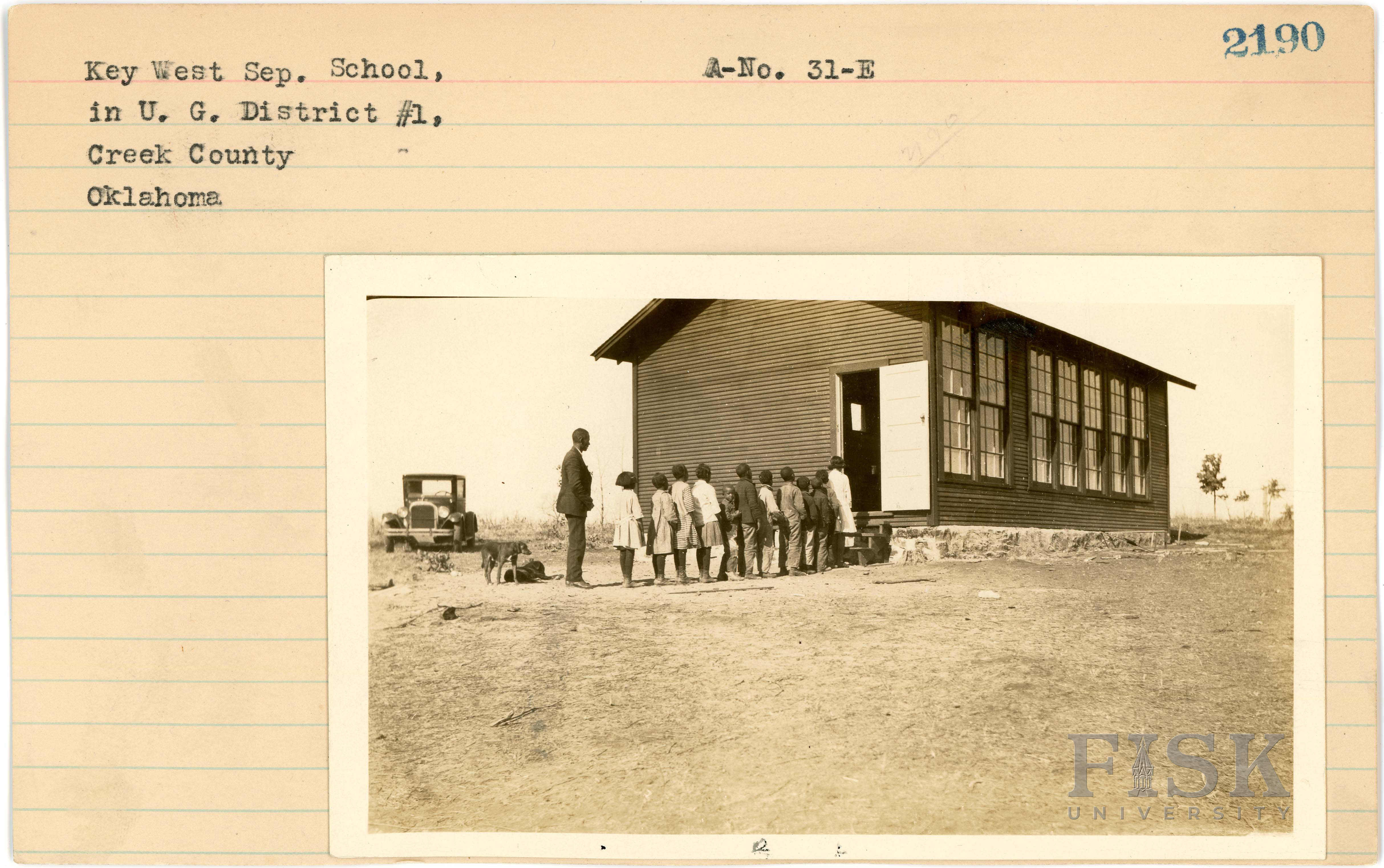 - Photo of students at Key West Separated School in Creek County, Oklahoma on the front of the school card; photo of Key West Separated School in Creek County, Oklahoma on the back