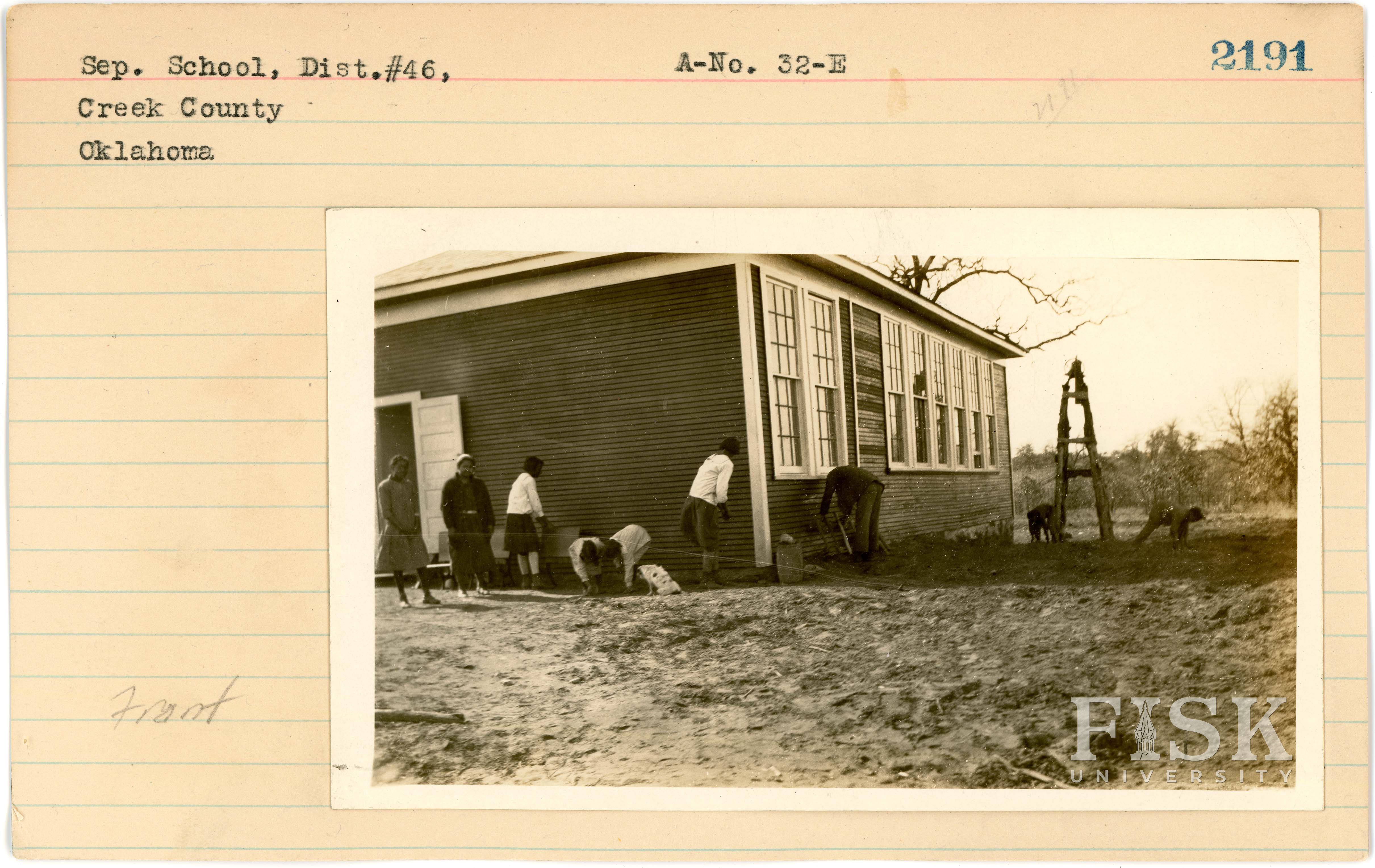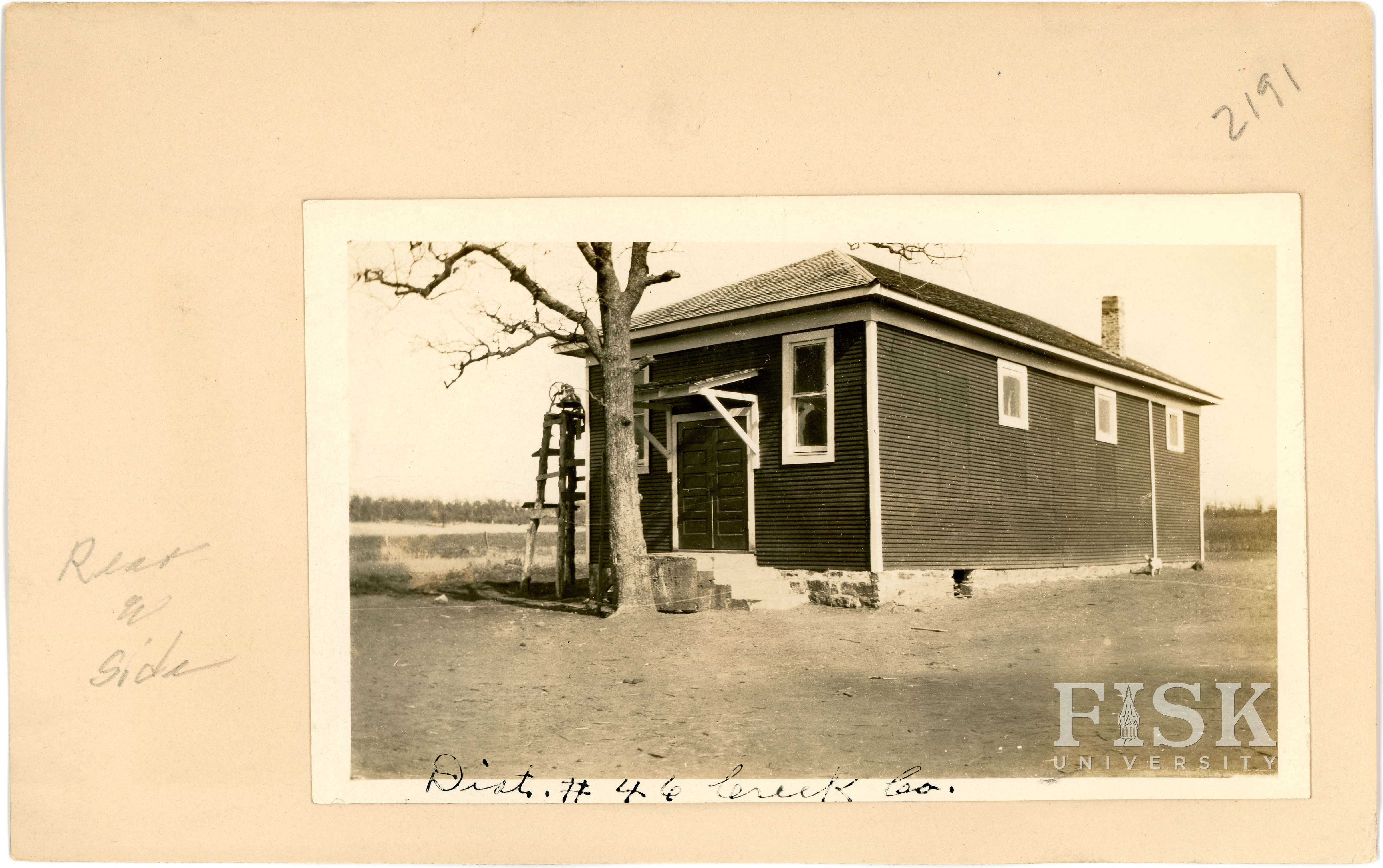 - Photo of Separated School District No. 46 in Creek County, Oklahoma with a note on the front of the school card that says, "Front"; photo of Separated School District No. 46 in Creek County, Oklahoma on the back with a note that says, "Rear & Side" and an inscription that says, "Dist. #46 Creek Co."