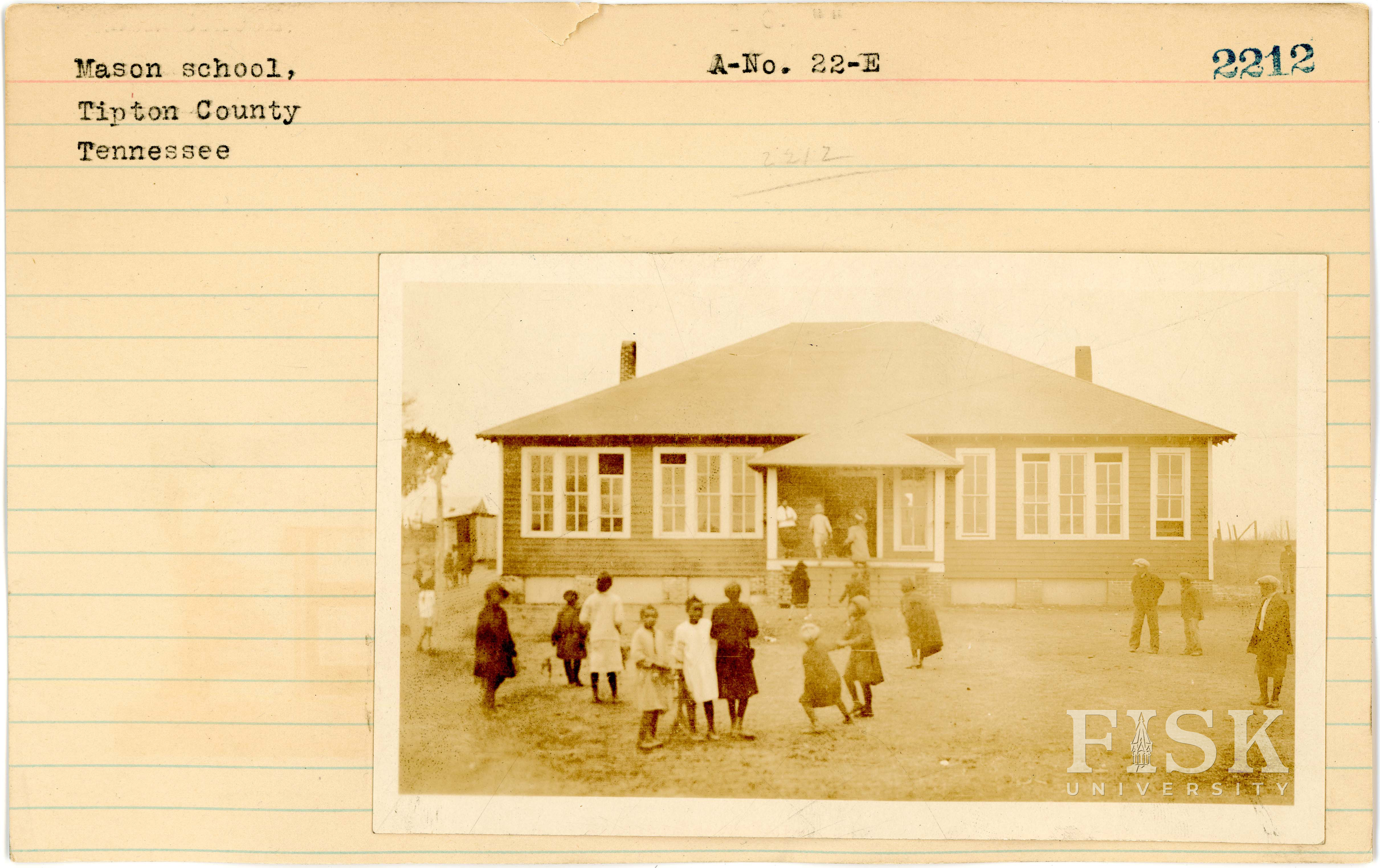 - Photo of stiudents at Mason School in Tipton County, Tennessee on front of the school card; photo of Mason School in Tipton County, Tennessee on the back