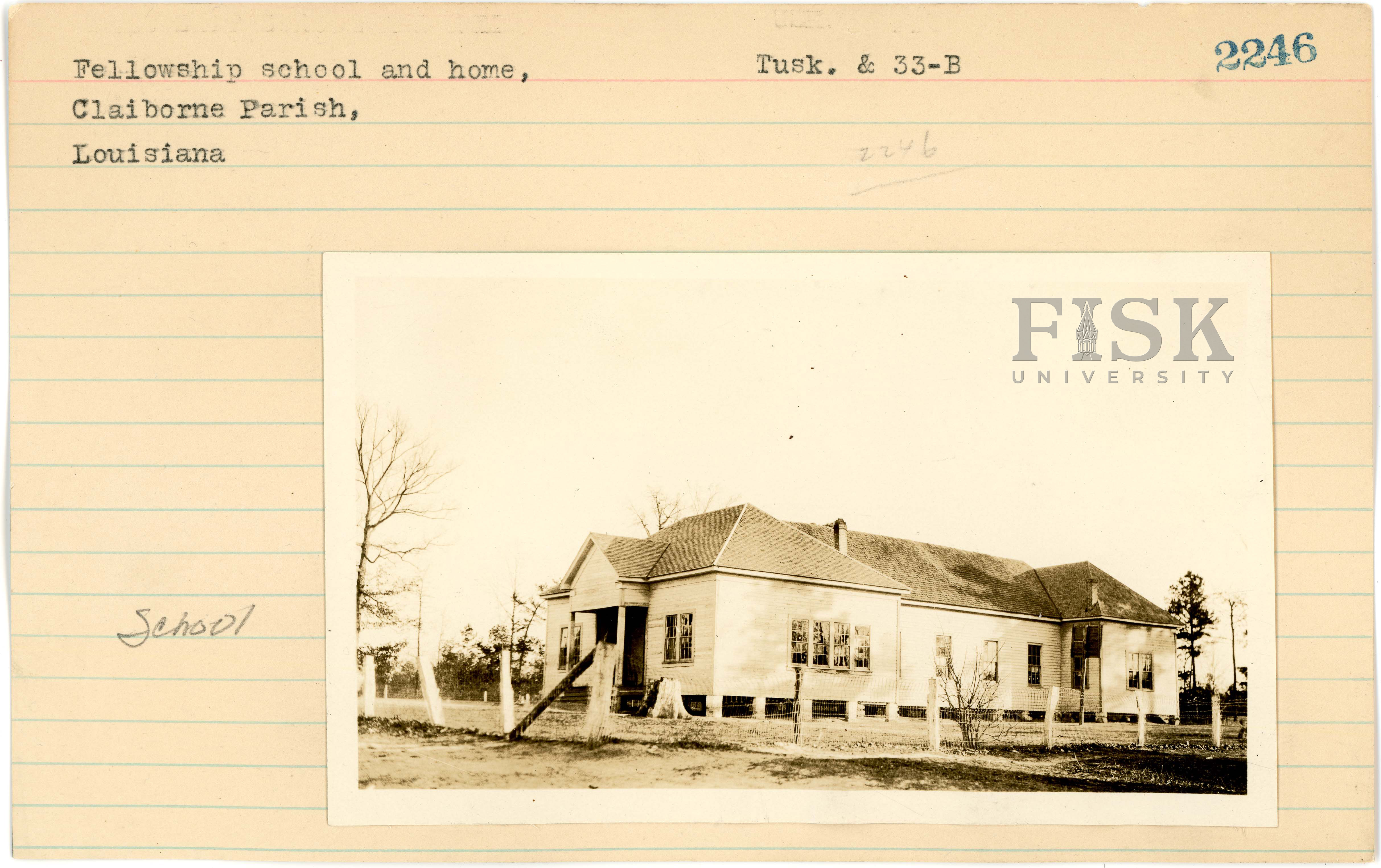 - Photos of Fellowship School in Claiborne Parish, Louisiana with notes on the front of the school card that say, "Tusk" and "School"