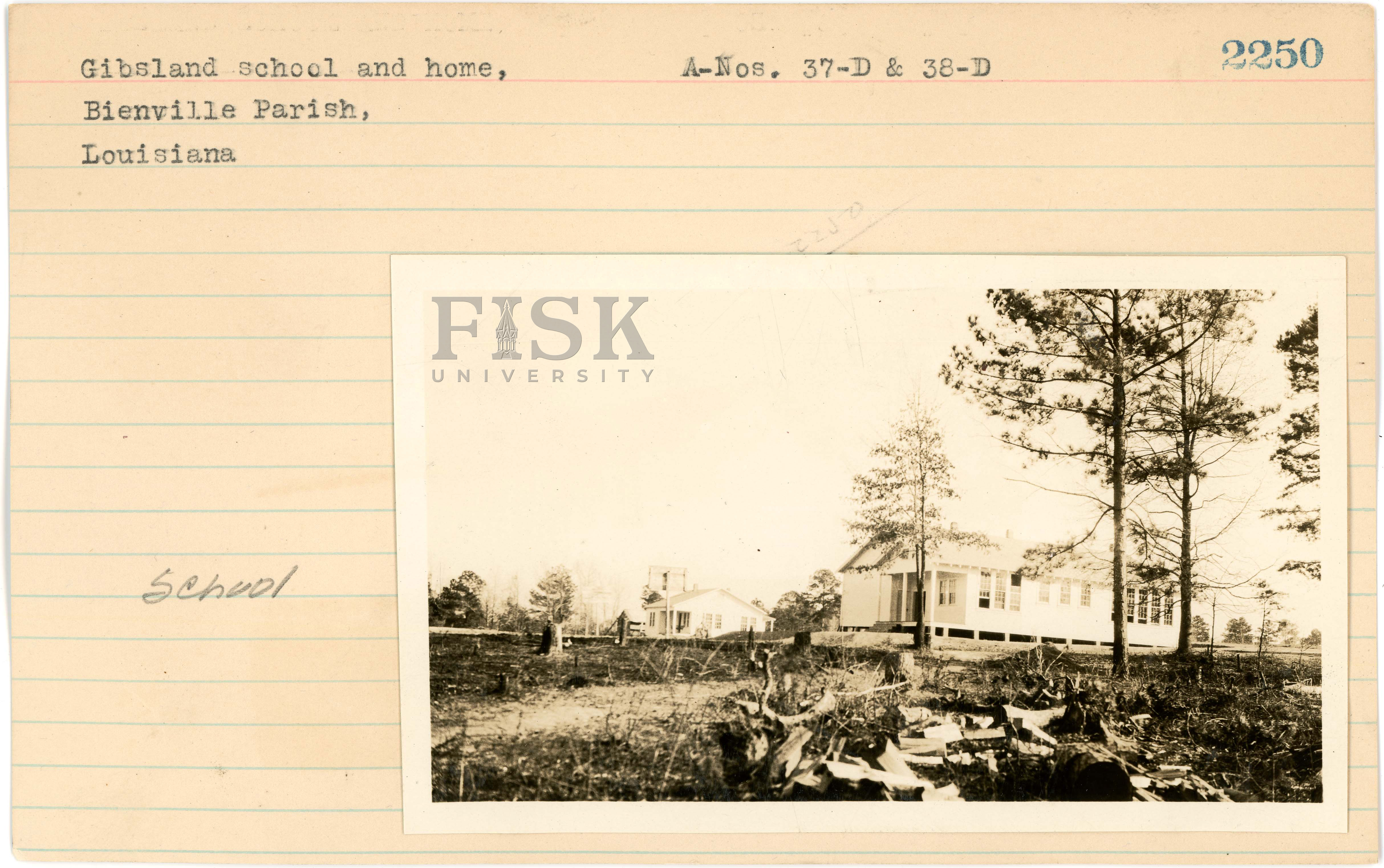 - Photo of Gibsland School in Bienville Parish, Louisiana with a note on the front of the school card that says, "School"; photo of the teacher's home at Gibsland School in Bienville Parish, Louisiana on the back with a note that says, "Home"