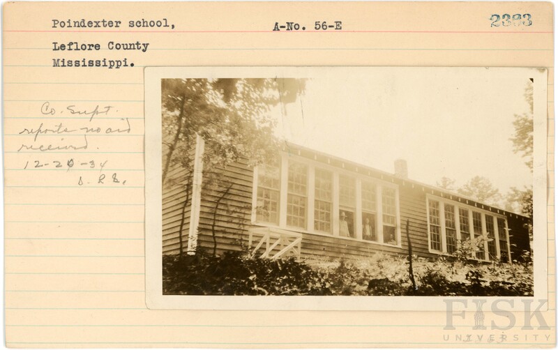 - Photo of Poindexter School in Leflore County, Mississippi with a note on the card that says, "Co. [unclear] reports no aid received. 12-20-34 [unclear]"