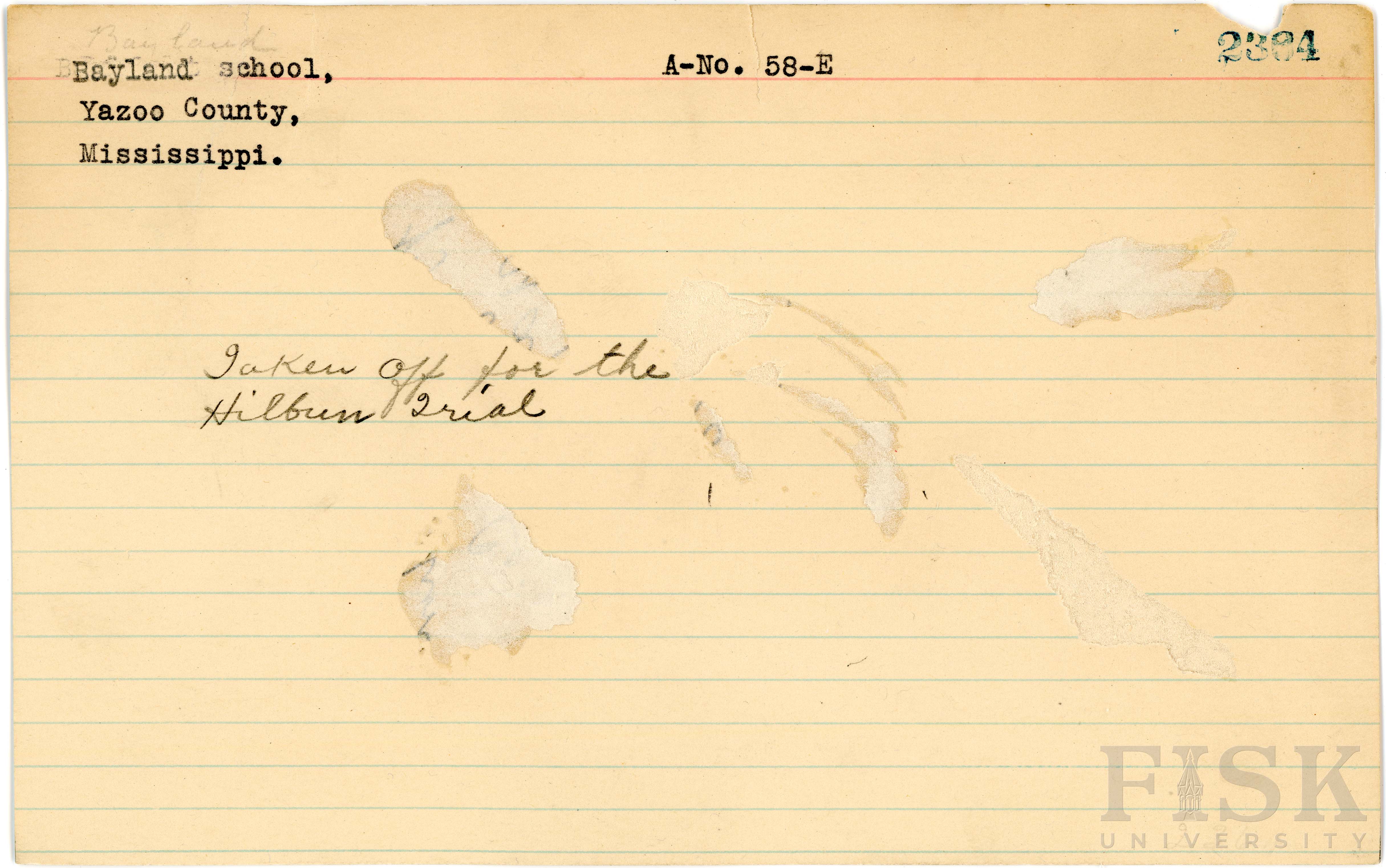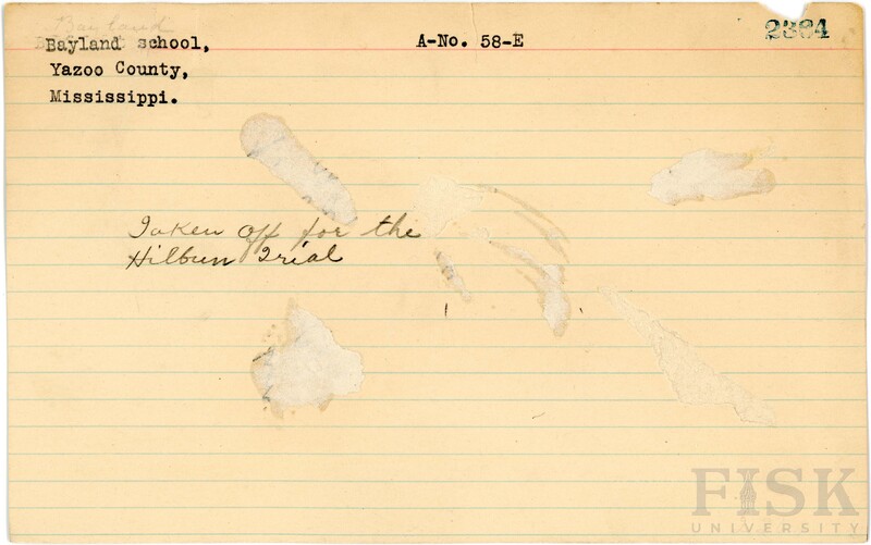 - School photo card of Bayland School in Yazoo County, Mississippi with no photo attached and a note on the card that says, "Taken off for the Hilbun Trial"