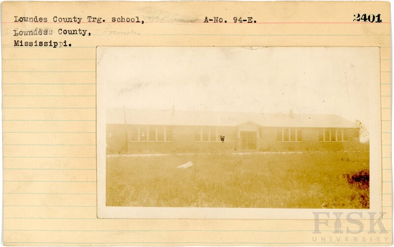 - Photo of County Training School in Lowndes County, Mississippi on the front of the school card; photo of two men at County Training School in Lowndes County, Mississippi on the back of the card
