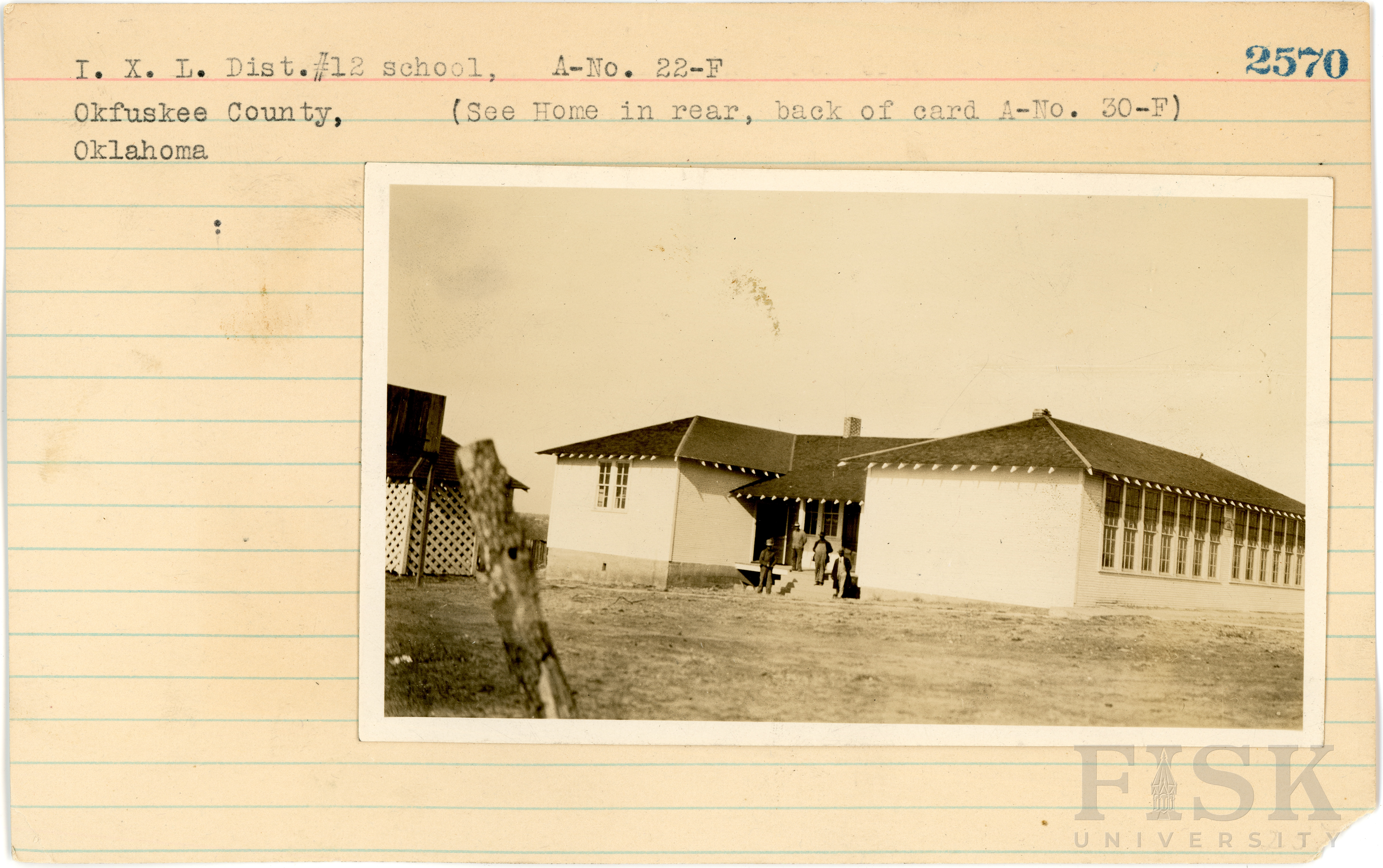 - Photos of I.X.L. Dist. No. 12 School in Okfuskee County, Oklahoma with a note on the front of the school card that says, "(See Home in rear, back of card A-No. 30-F)"