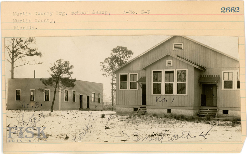 - Photo of County Training School and shop in Martin County, Florida with inscriptions that say, "No 1. No 3." and "Walk Shop Cement walk"