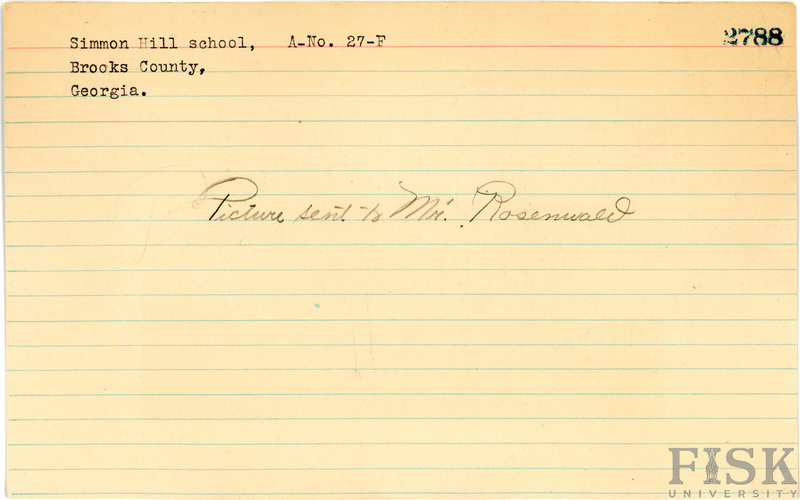 - School photo card for Simmon Hill School in Brooks County, Georgia with no photo attached with a note that says, "Picture sent to Mr. Rosenwald"