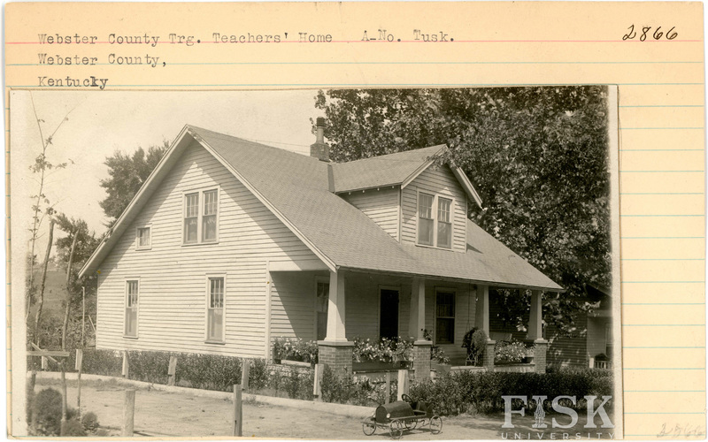 - Photo of the teacher's home at County Training School in Webster County, Kentucky with a note on the card that says, "A-No. Tusk."