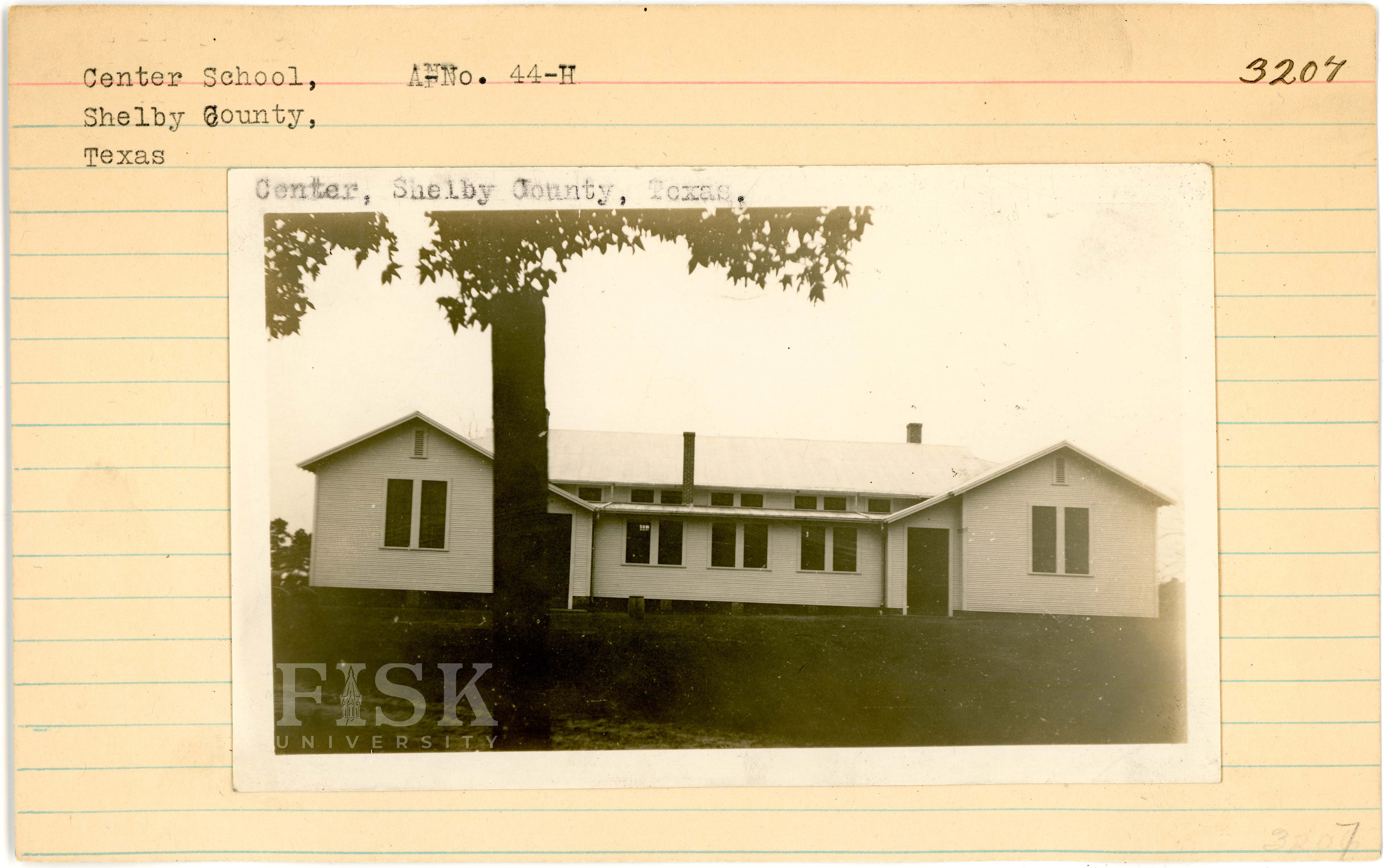 - Photo of Center School in Shelby County, Texas on the front of the school card with an inscription that says, "Center, Shelby County, Texas"; photo of the interior of Center School in Shelby County, Texas on the back of the photo card with several women standing in the classroom