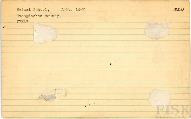 - School card for Bethel School in Nacogdoches County, Texas with no photo attached on the front; photo of Bethel School in Nacogdoches County, Texas on the back of the card