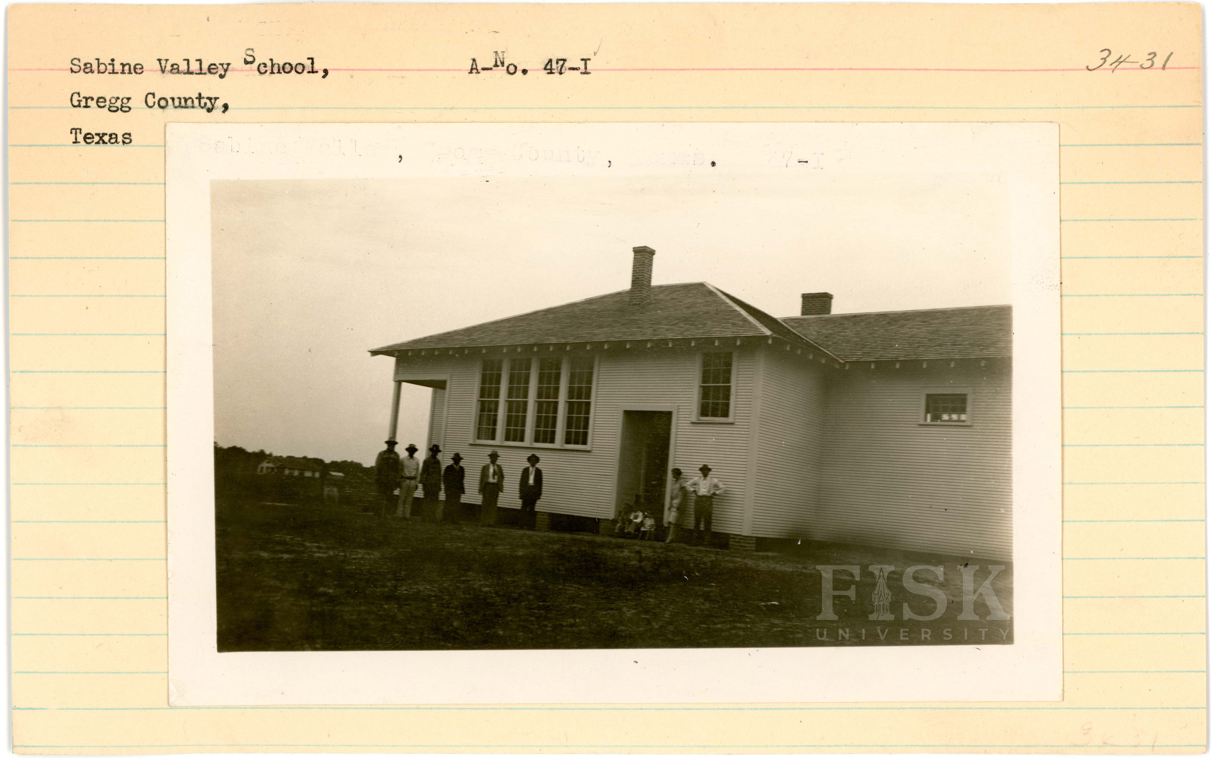 - Photo of pupils at Sabine Valley School in Gregg County, Texas on the front of the school card; photo of Sabine Valley School in Greg County, Texas on the back of the card