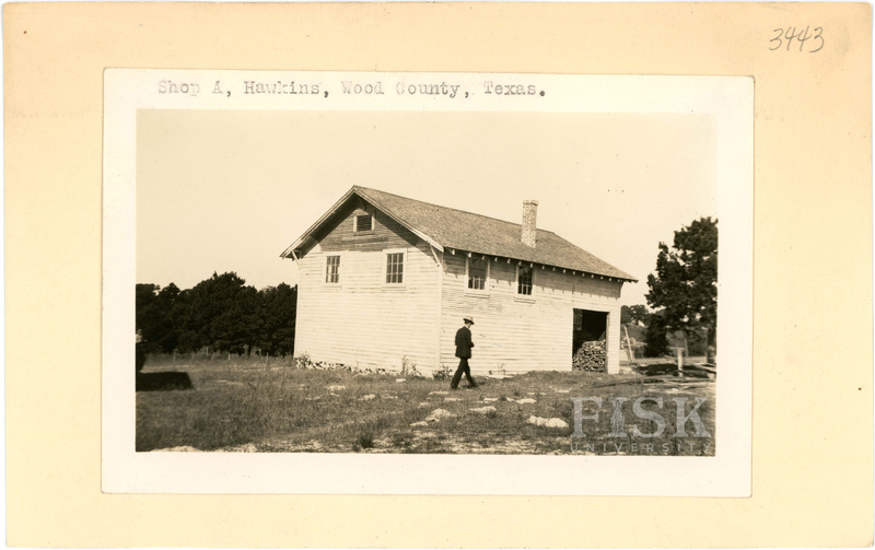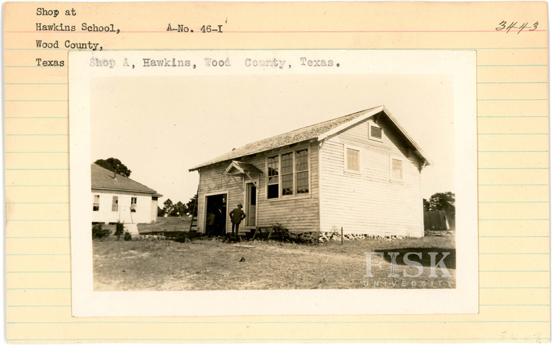 - Photos of the shop at Hawkins School in Wood County, Texas with inscriptions that say, "Shop A, Hawkins, Wood County, Texas"