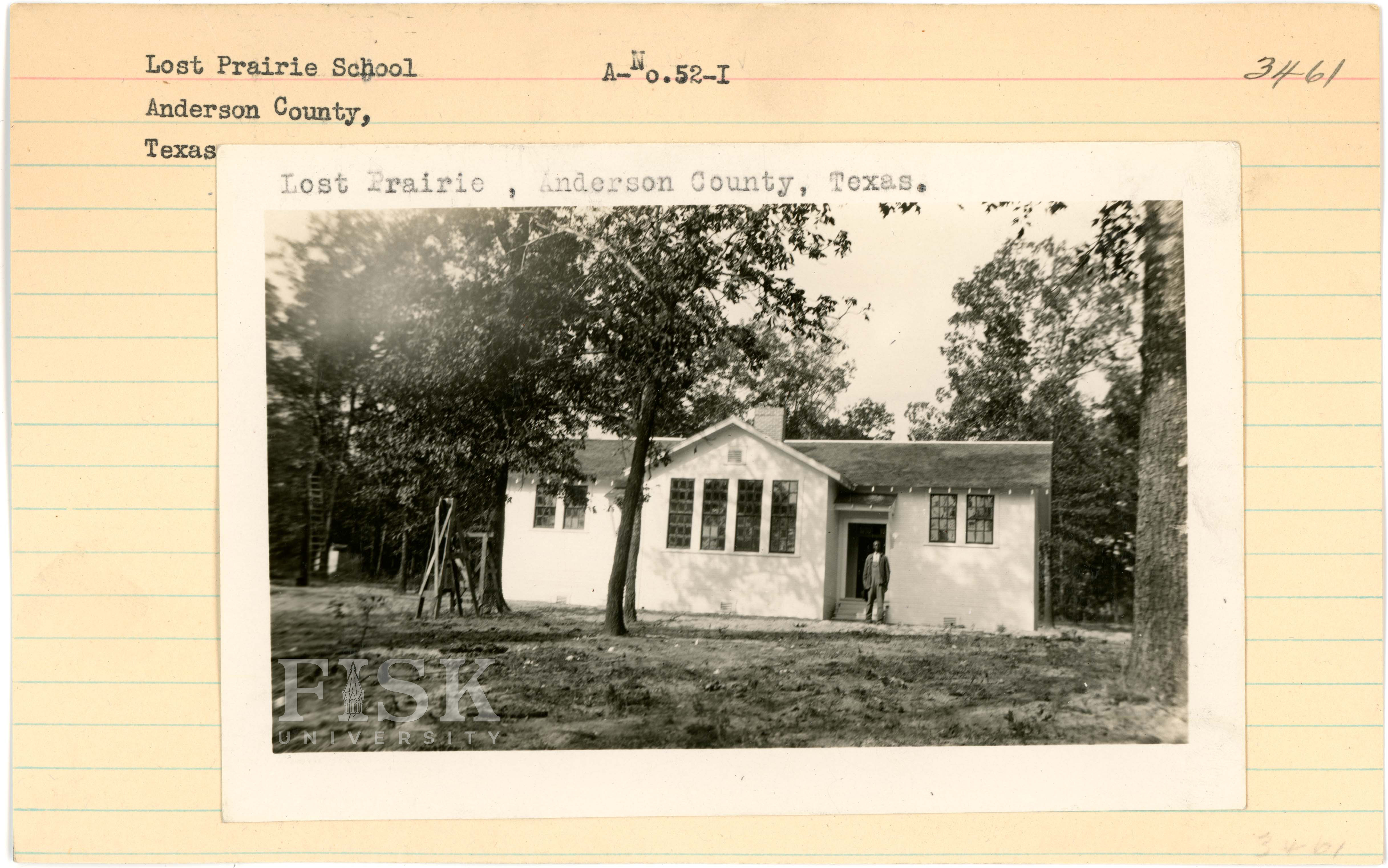 - Photos of Lost Prairie School in Anderson County, Texas with inscriptions that say, "Lost Prairie, Anderson County, Texas"