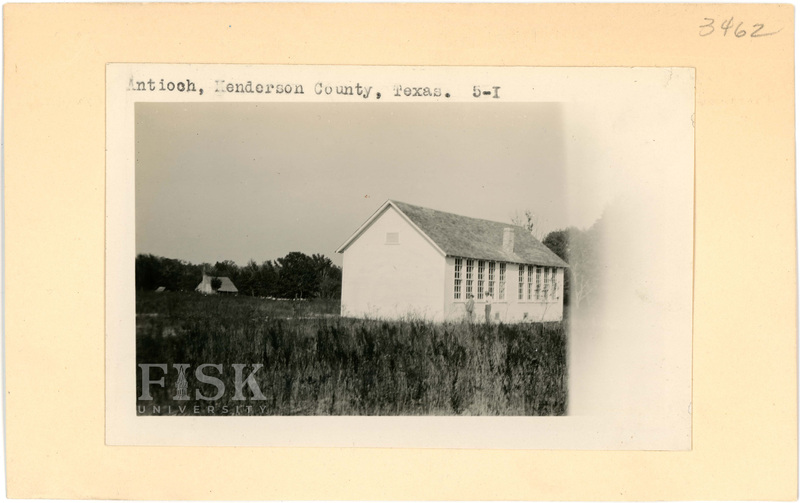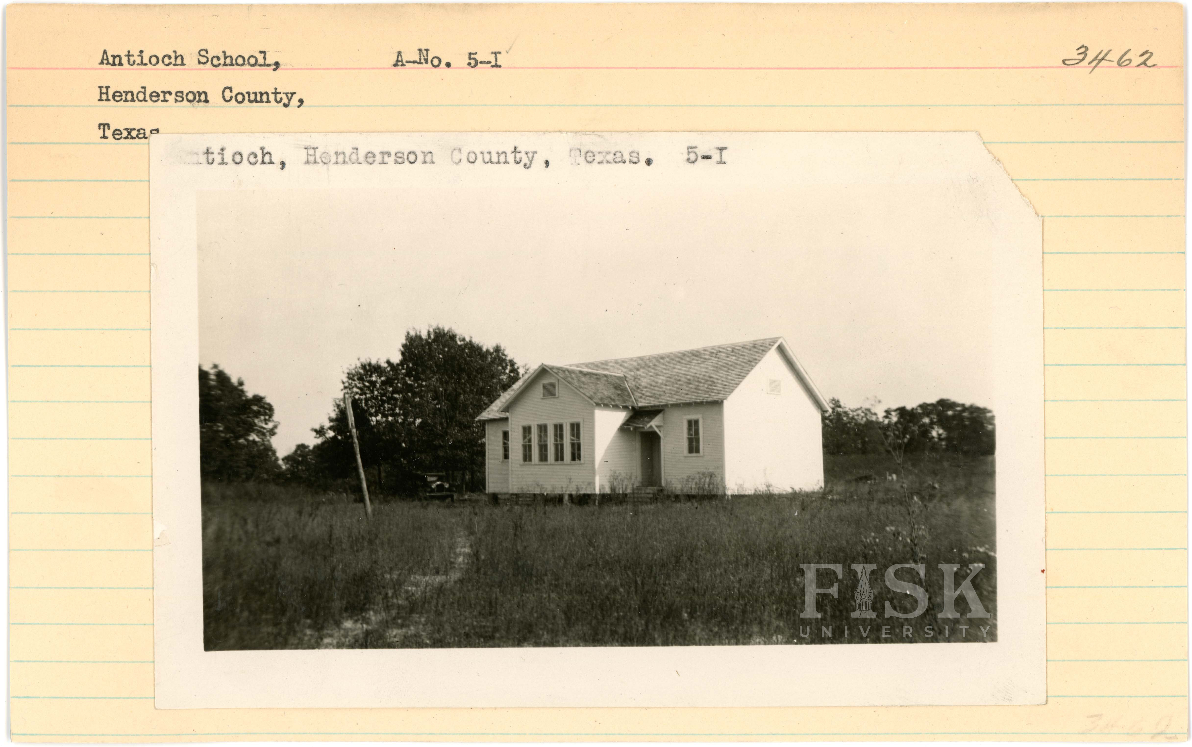 - Photos of Antioch School in Henderson County, Texas with inscriptions that say, "Antioch, Henderson County, Texas. 5-T"