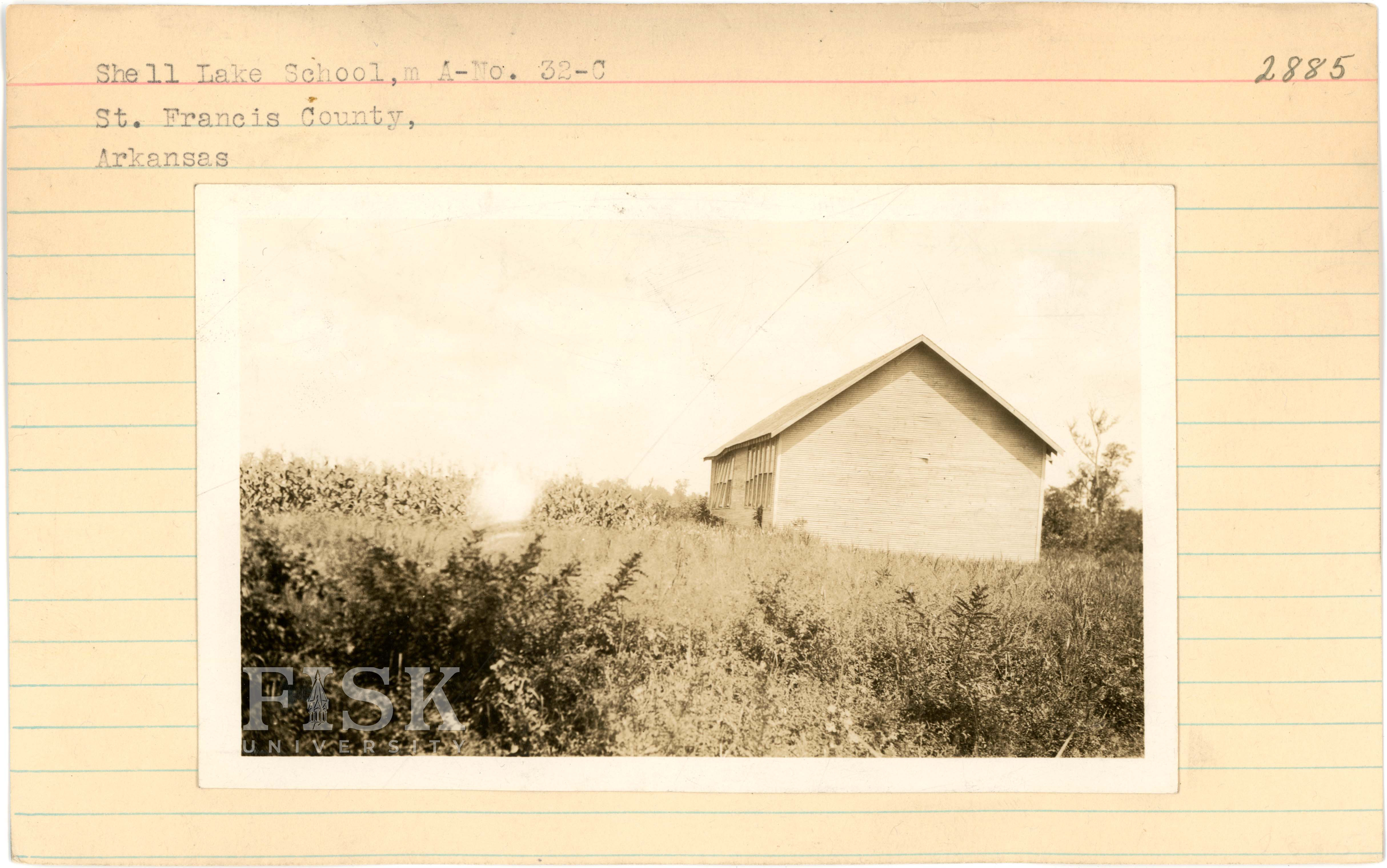 - Photo of Shell Lake School in St. Francis County, Arkansas on the front of the schol card; photo of the interior of the Shell Lake School in St. Francis County, Arkansas on the back of the card