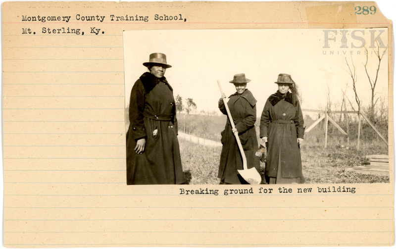 - Photo of three women standing on the plot of land for County Training School in Montgomery County, Kentucky with a note on the card that says, "Breaking ground for the new building". The woman in the middle holds a shovel.