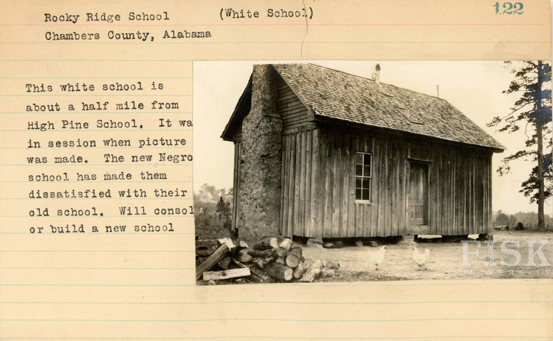 - Photo of Rocky Ridge School in Chambers County, Alabama with notes on the card that say, "(White School)" and "This white school is about a half mile from High Pine School. It was in session when picture was made. The new Negro school has made them dissatisfied with their old school. Will consol[unclear] or build a new school"