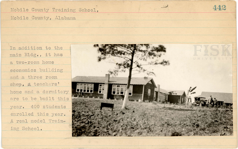 - Photos of County Training School in Mobile County, Alabama with a note on the front of the school card that says, "In addition to the main Bldg., it has a two-room home economics building and a three room shop. Teachers' home and a dormitory are to be built this year. 400 students enrolled this year. A real model Training School"