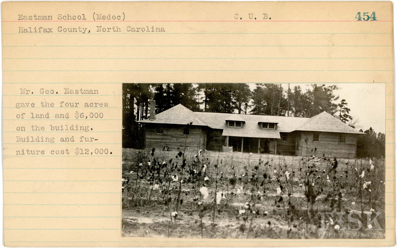 - Photos of Eastman School in Halifax County, North Carolina with notes on the front of the school card that say, "C. U. B." and "Mr. Geo Eastman gave the four acres of land and $6,000 on the building. Building and furniture cost $12,000"