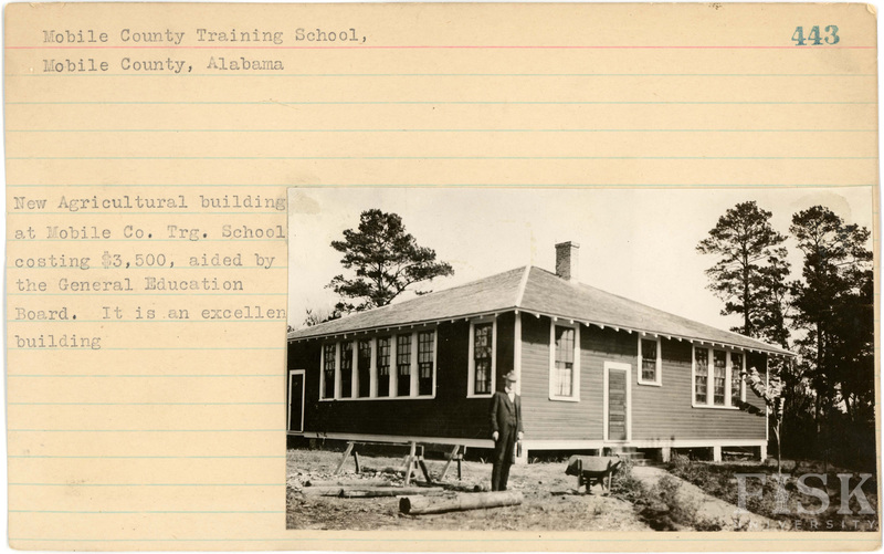 - Photos of County Training School in Mobile County, Alabama with a note on the front of the school card that says, "New Agricultural building at Mobile Co. Trg. School costing $3,500, aided by General Education Board. It is an excellent building"