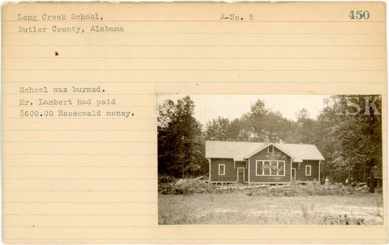 - Photo of Long Creek School in Butler County, Alabama with a note on the card that says, "School was burned. Mr. Lambert had paid $600.00 Rosenwald money"
