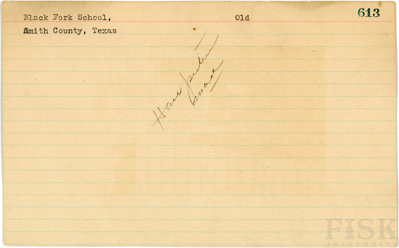- School photo card for Black Fork School in Smith County, Texas with no photo attached. Notes on the card say, "Old" and "Have picture made"