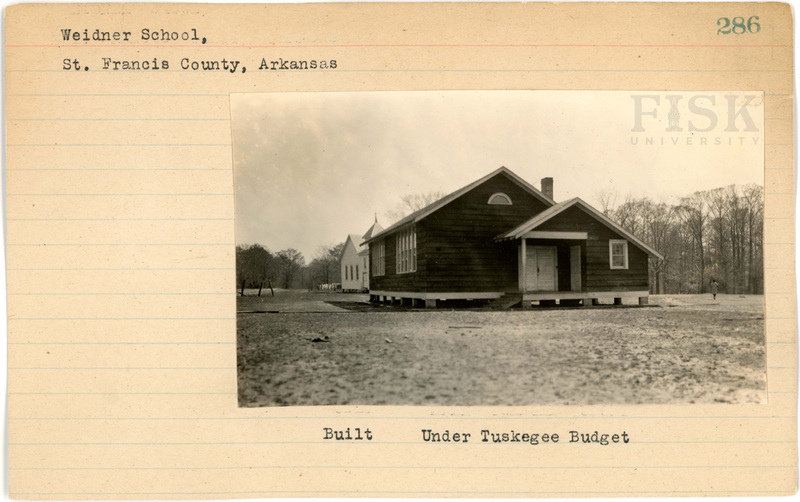 - Photo of Weidner School in St. Francis County, Arkansas with a note on the card that says, "Built Under Tuskegee Budget"