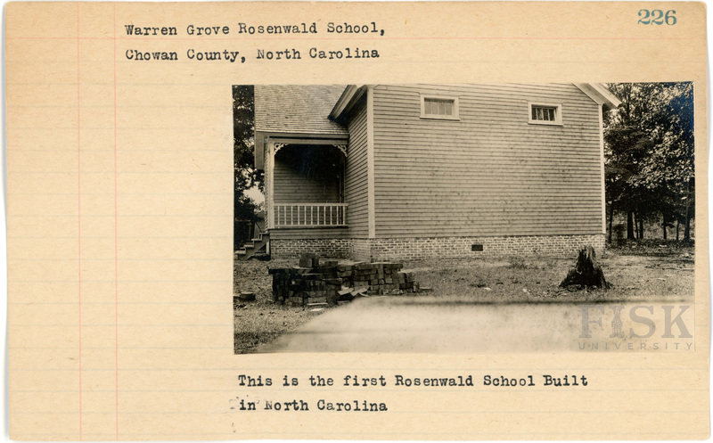 - Photo of Warren Grove Rosenwald School in Chowan County, North Carolina with a note on the card that says, "This is the first Rosenwald School Built in North Carolina"