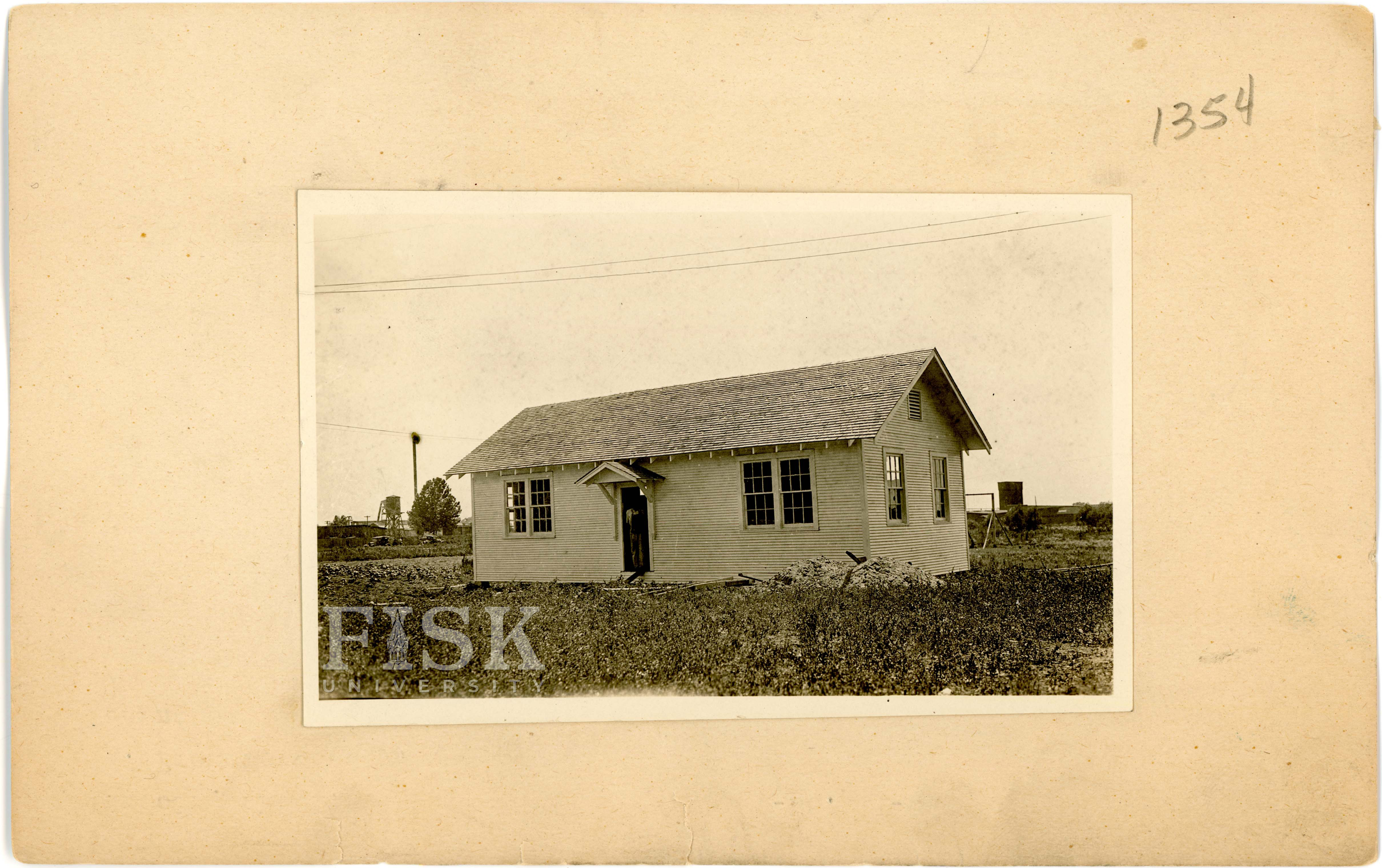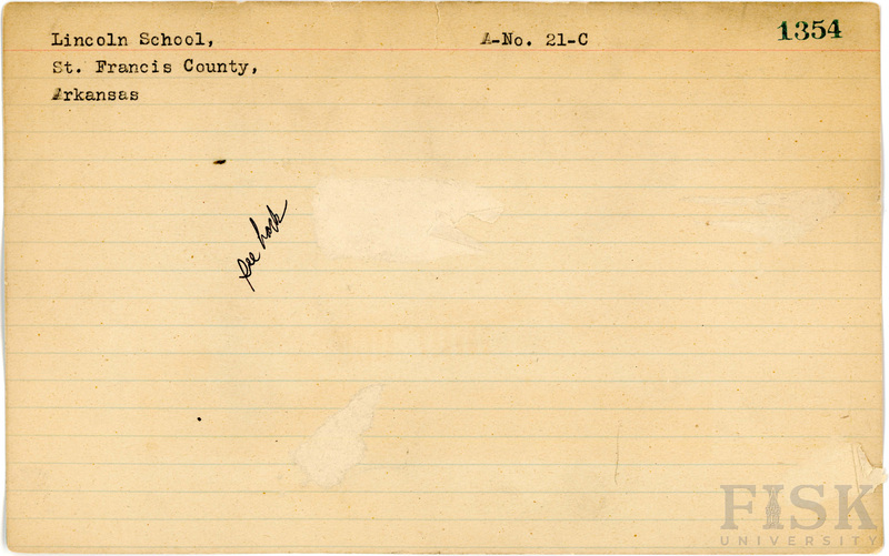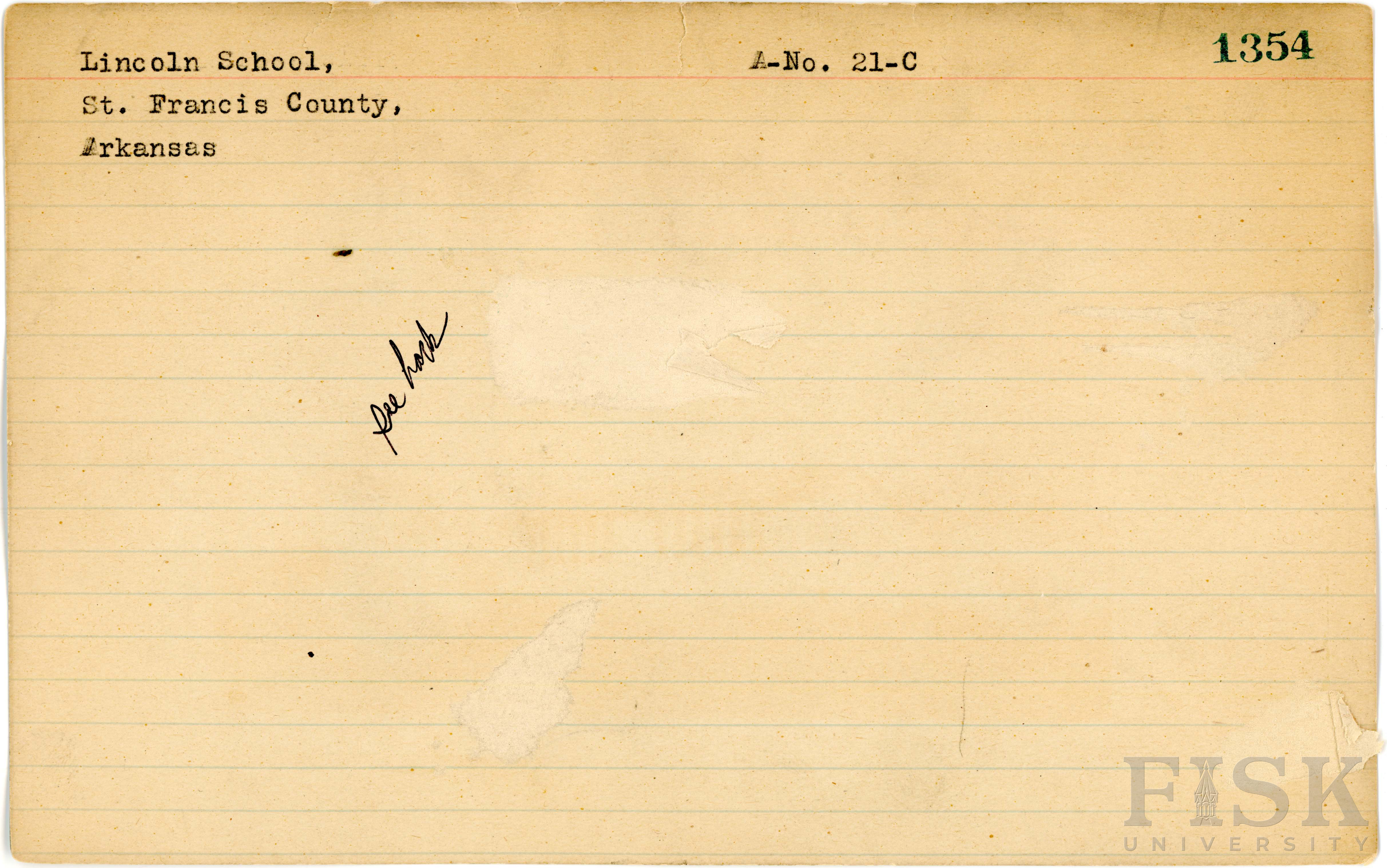 - School photo card for Lincoln School in St. Francis County, Arkansas with no photo attached on the front of the card and a note that says, "See back"; photo of Lincoln School in St. Francis County, Arkansas on the back of the card