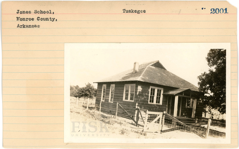 - Photos of Jones School in Monroe County, Arkansas with a note on the card that says, "Tuskegee"