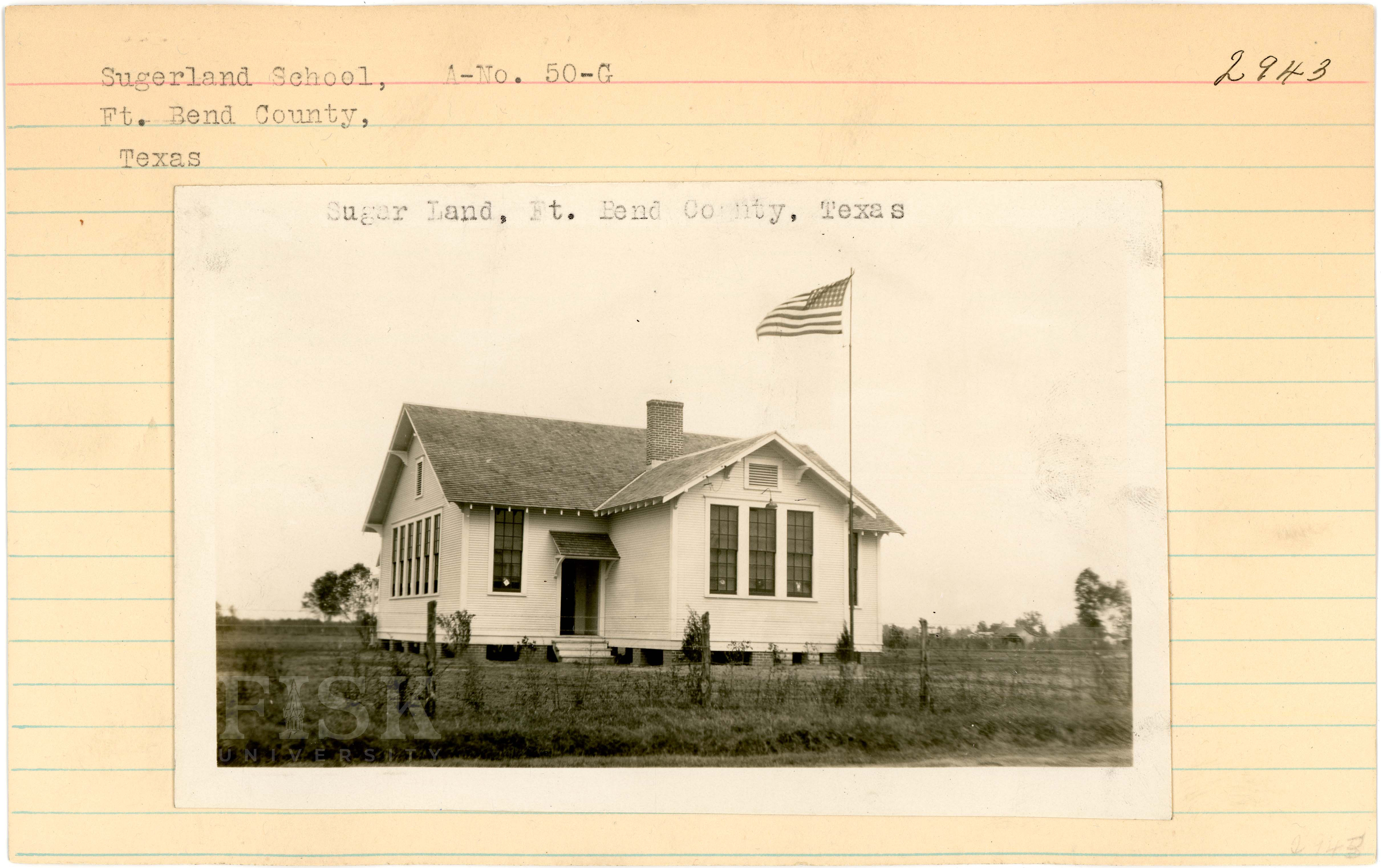 - Photos of Sugarland School in Fort Bend County, Texas with inscriptions that say, "Sugar Land, Ft. Bend County, Texas"