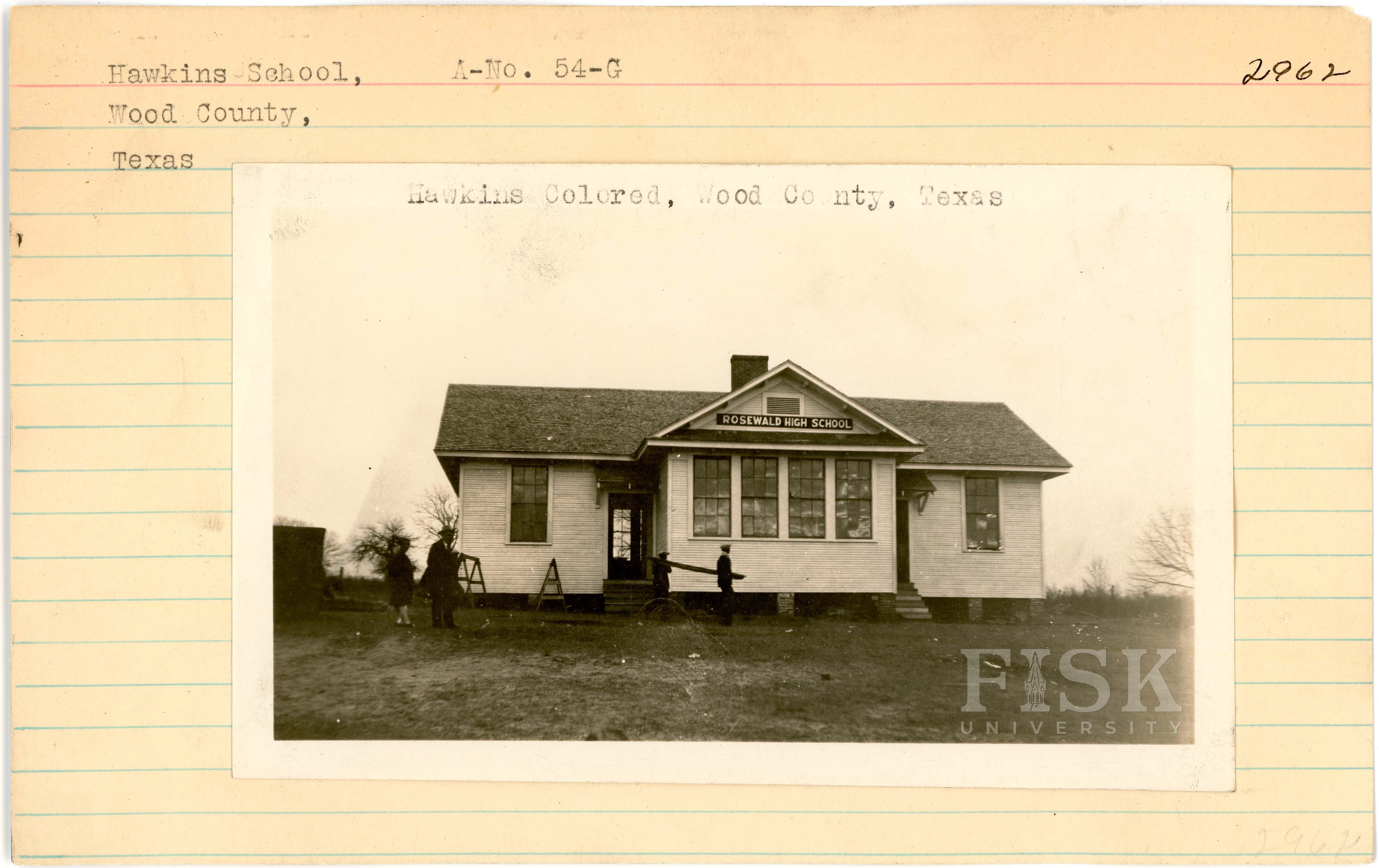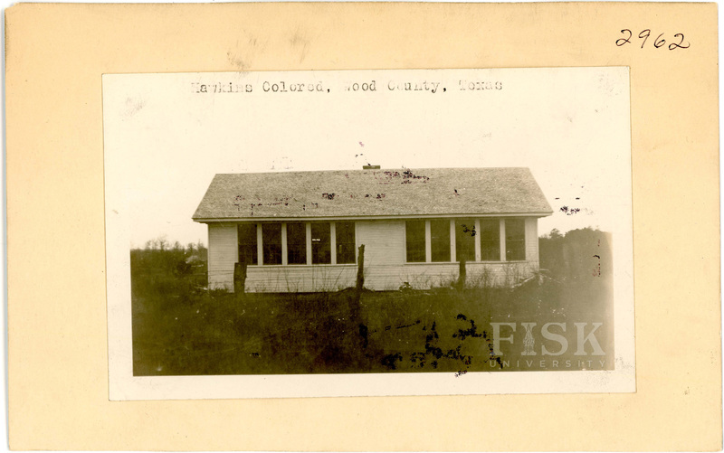 - Photos of Hawkins School in Wood County, Texas with inscriptions that say, "Hawkins Colored, Wood County, Texas"