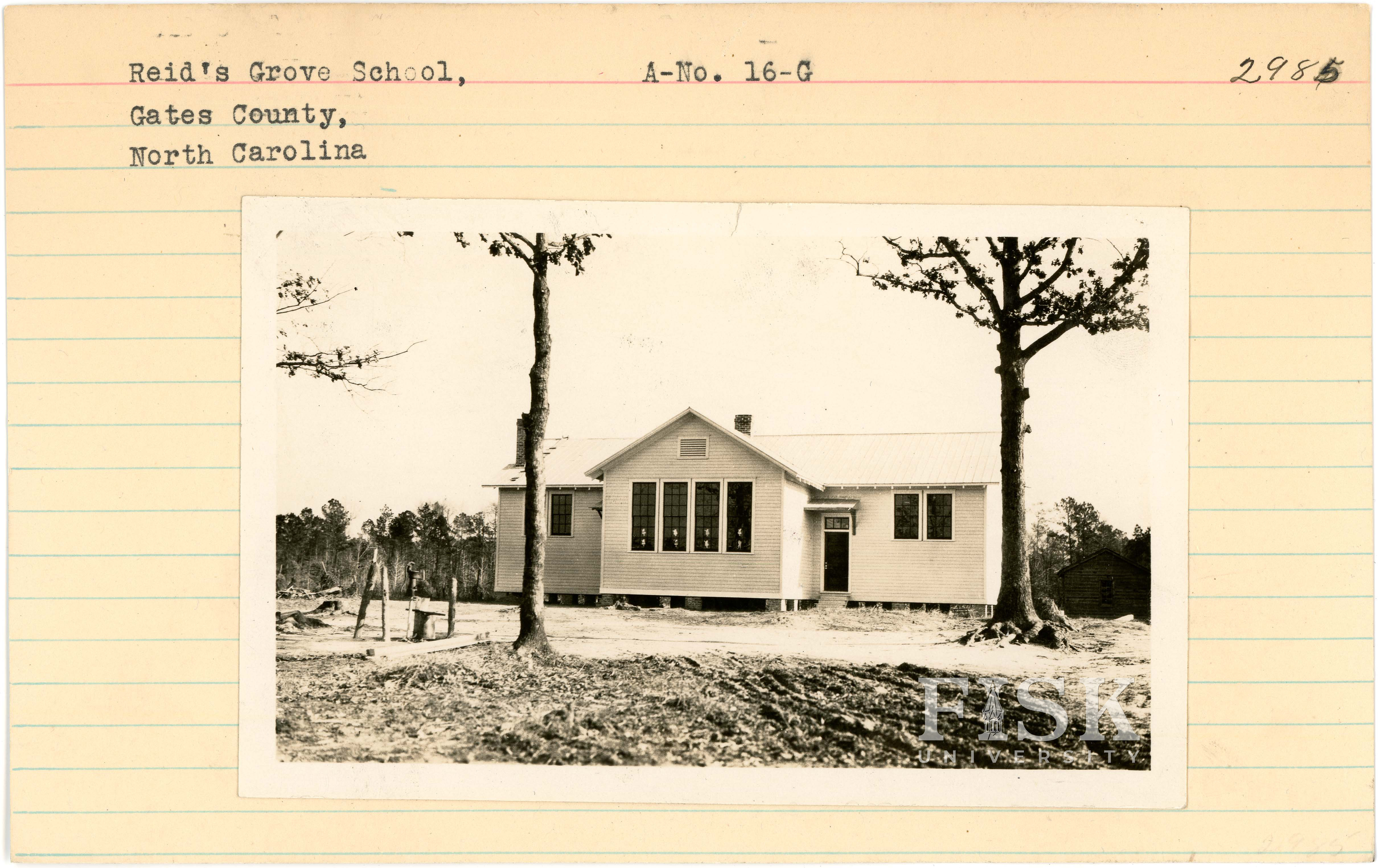 - Photo of Reid's Grove School in Gates County, North Carolina on the front of the school card; photo of Reid's Grove School in Gates County, North Carolina on the back of the card