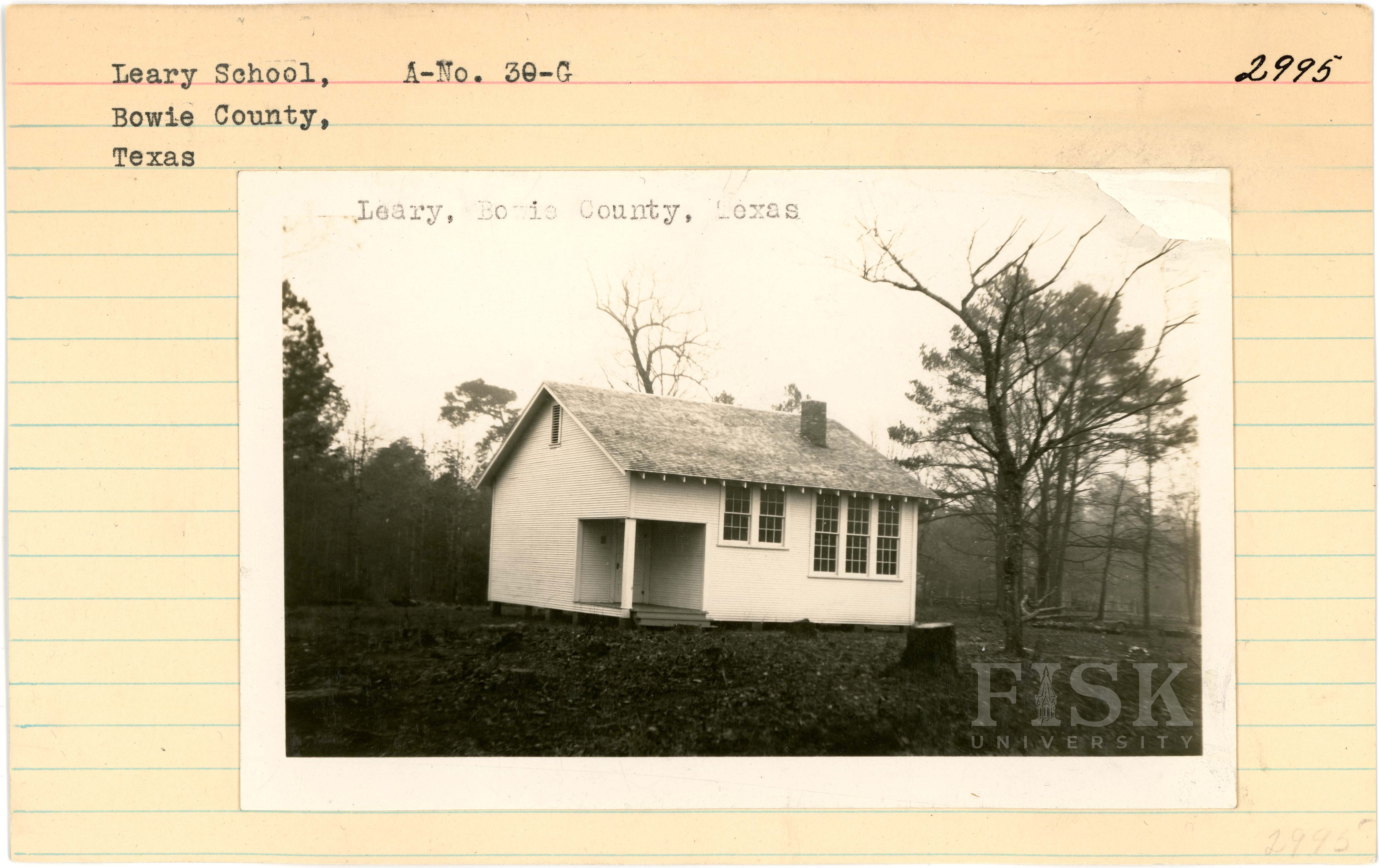 - Photos of Leary School in Bowie County, Texas with an inscription on the front photo that says, "Leary, Bowis County, Texas"